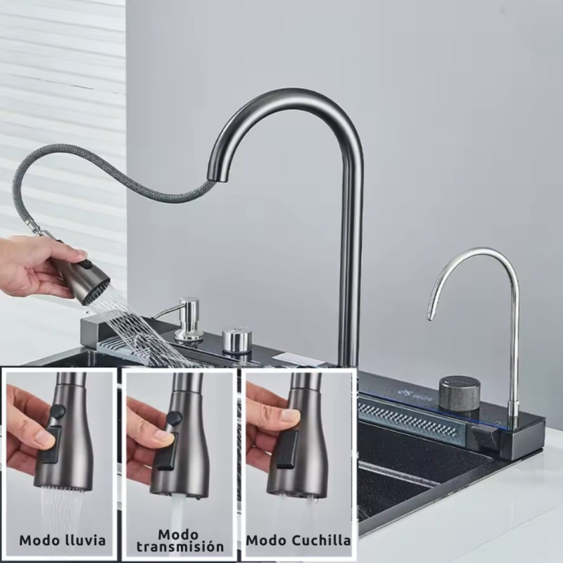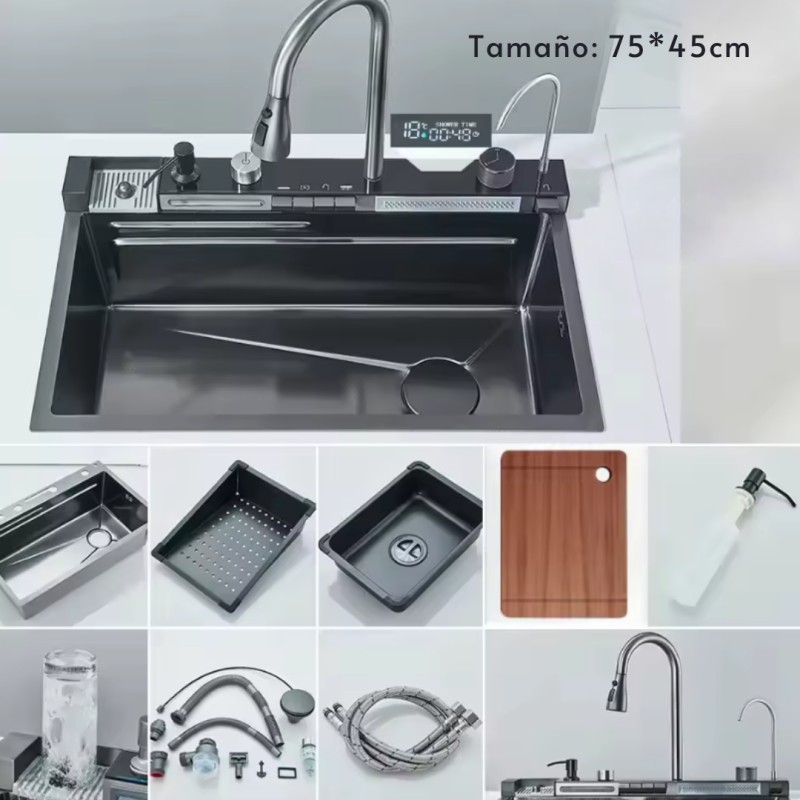 Los accesorios incluyen: Grifo multifuncional*1 Lavabo de acero inoxidable*1 Cesta de drenaje*1 Tabla de cortar*1 Kit de tubería de drenaje*1 Escurridor*1 Manguera*2
