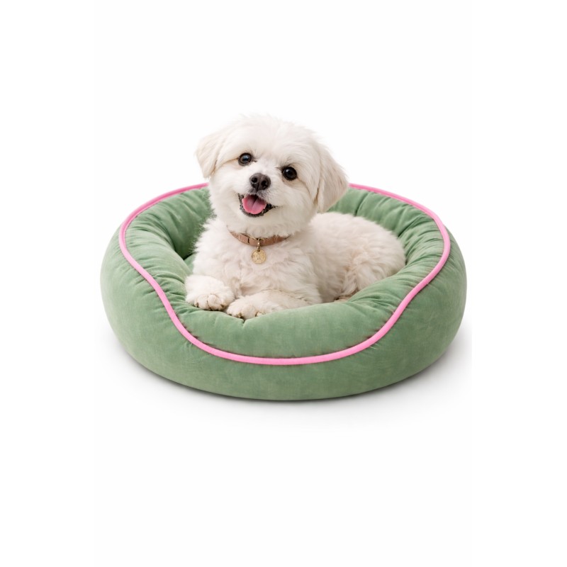 Cama circular para tu mascota pequeña color verde con letras de colores.